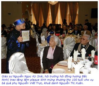 Thay mặt ban tổ chức, ông đã trao tặng tấm plaque kính mừng thượng thọ 100 tuổi cho cụ bà quả phụ Nguyễn Viết Trực, khuê danh Nguyễn Thị Xuân, ông kính chúc cụ bà hết Xuân này, sẽ còn Xuân tiếp, đến dự Xuân với hội.
